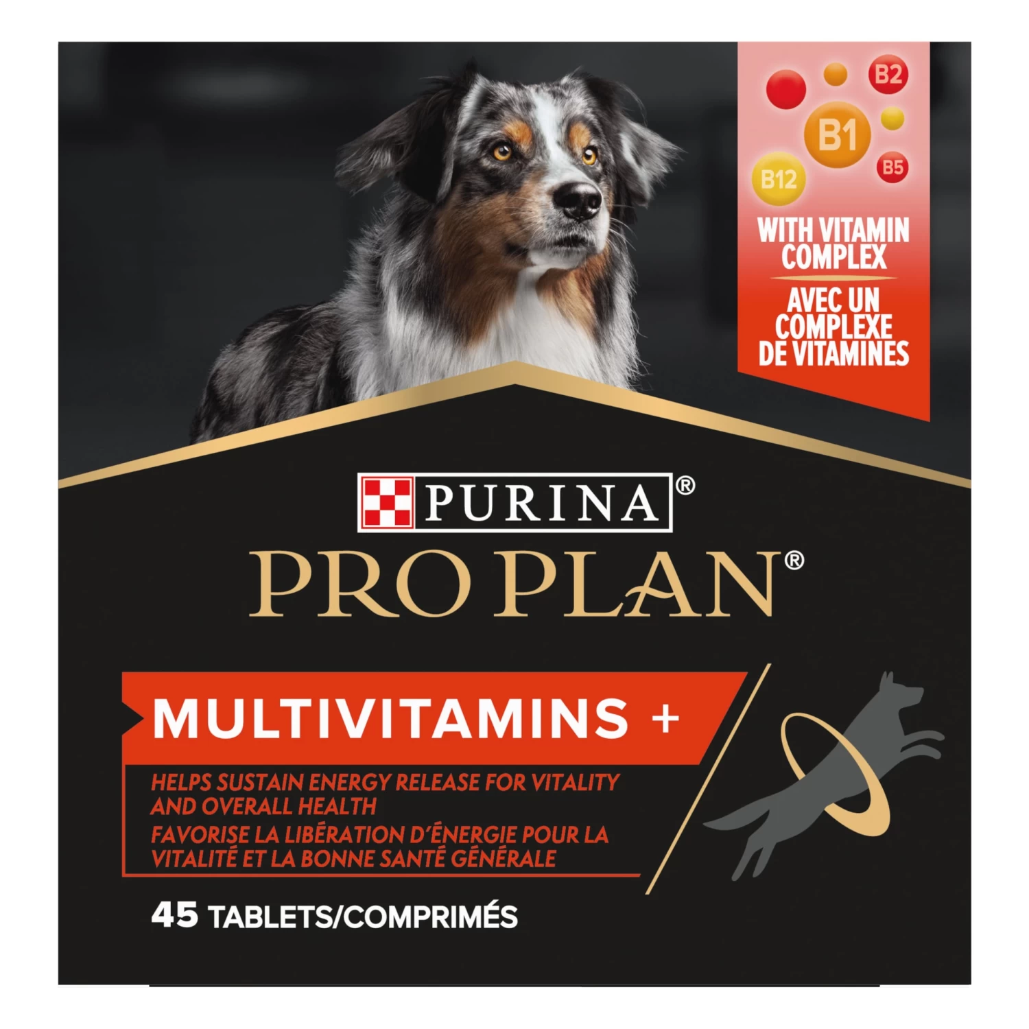 PRO PLAN® a mis au point une gamme d’aliments complĂ©mentaires ciblĂ©s destinĂ©s Ă agir sur la mobilitĂ©, l’immunitĂ©, la vitalitĂ©, la digestion, la peau & le pelage et le bien-ĂŞtre. PRO PLAN® Multivitamin+ garde votre chien plein de vitalitĂ© car il contient un complexe de vitamines (vitamines B1, B2, B3, B5, B6, B12). Sa formule est scientifiquement conçue pour : – Favoriser la libĂ©ration d’énergie pour la vitalitĂ© et la bonne santĂ© gĂ©nĂ©rale – Aider Ă soutenir une peau et un pelage sain