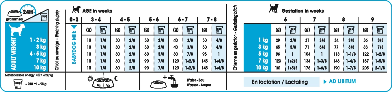 Pour les chiennes pendant la gestation et la lactation et pour les chiots du sevrage jusqu’Ă l’âge de 2 mois. Disponible en 1kg, 3kg en 8kg.
