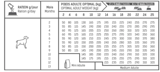 Une énergie métabolisable raisonnée, un apport en calcium et phosphore modéré en font l’aliment de choix pour les chiots de grande taille qui nécessitent une croissance lente et contrôlée.